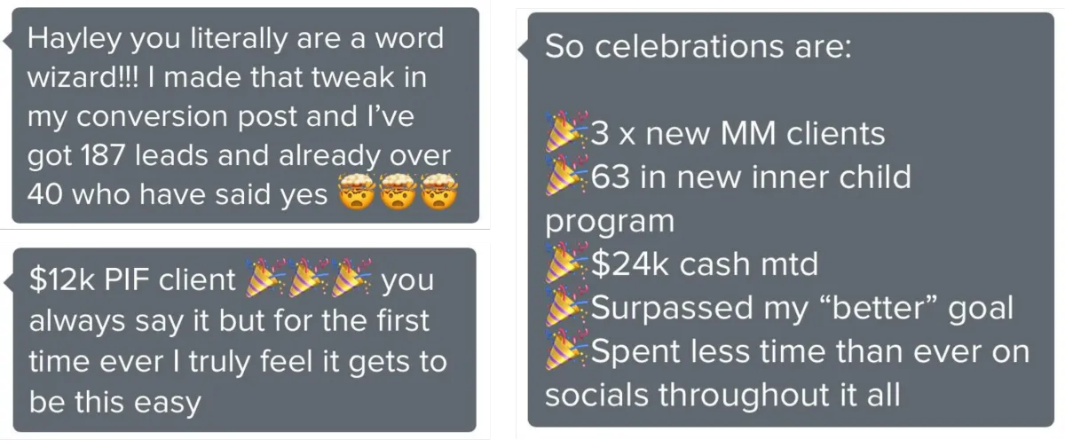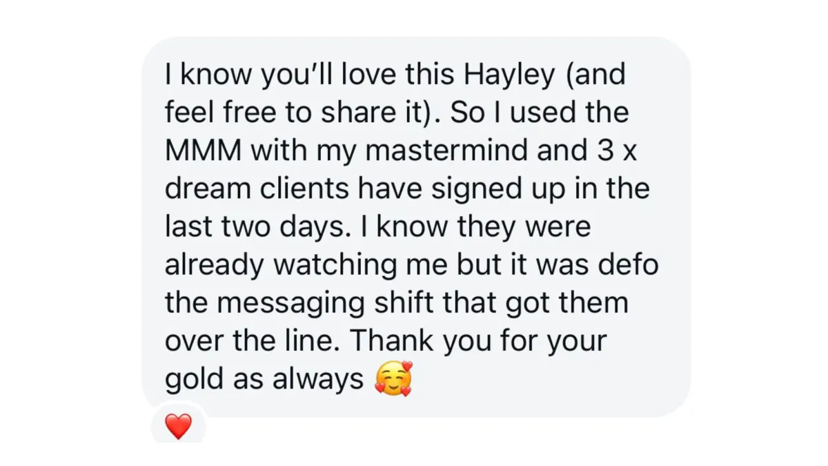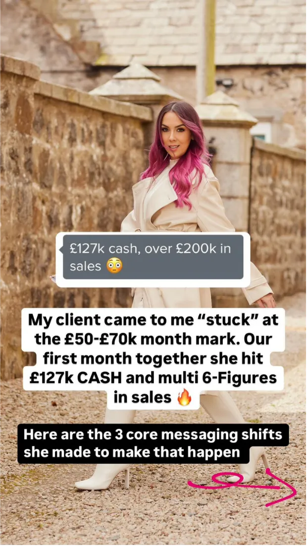 I scaled to 6-figure months in 5 months, with under 2,000 IG followers and zero ads. Every result my clients and I have created—multiple 7-figure businesses, 5-figure days, booked-out masterminds—was done with one thing: messaging that makes premium clients move instantly.